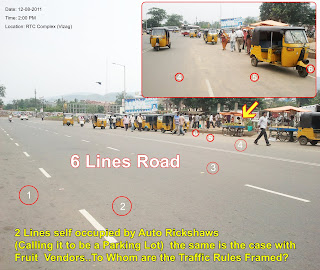 As it is clearly visible from the picture above, the two lanes of the total of 6 lanes is occupied by Auto Rikshaws and Fruit Vendors guarded/protected by a govt traffic constable.
